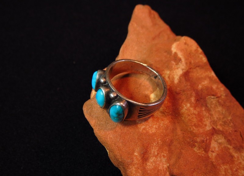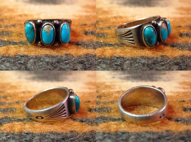 おそらくキャストではなくインゴットシルバー(銀塊)からハンマーワークによって成形された重厚なシャンクはセンターが少し広くなったシェイプで、左右対称に3つのターコイズがセットされ、その間には小さなシルバードロップが施されています。さらに、サイドにはアンティーク作品らしいプリミティブな印象のスタンプが刻まれています。ターコイズのベゼルもハンマーワークによって造形され、完成度の高いシルバーワークながら細かなディテールから1920年代以前の作品と推測されます。