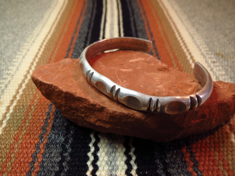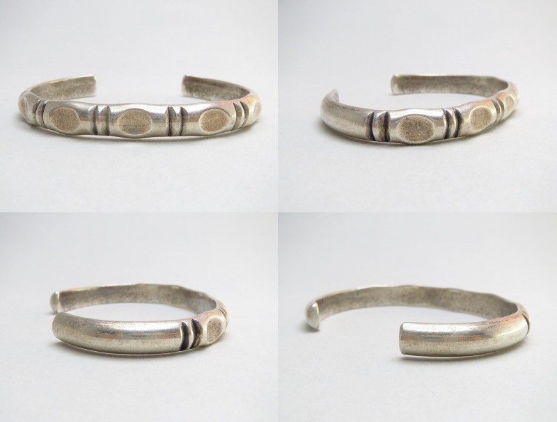 1950年代後半~1960年代製と推測され、おそらくある程度キャストで成形されたインゴットシルバー(銀塊)の地金をハーフラウンドワイヤーに成形してバンド/地金にし、ファイルワークと言う削ることによってライン模様を刻み、立体的な丸い断面を持つスタンプ(鏨)で地金のハーフラウンドを叩き凹ませることで、構築的で彫刻的な造形を構成しています。これらの凹みスタンプにより美しい光の反射が生み出されており、ナバホジュエリーの古くからの伝統技術を踏襲しながら新しい造形スタイルを試みたものと推測され、全く新しい印象とモダンで洗練された表情を持ったバングルに仕上げられています。