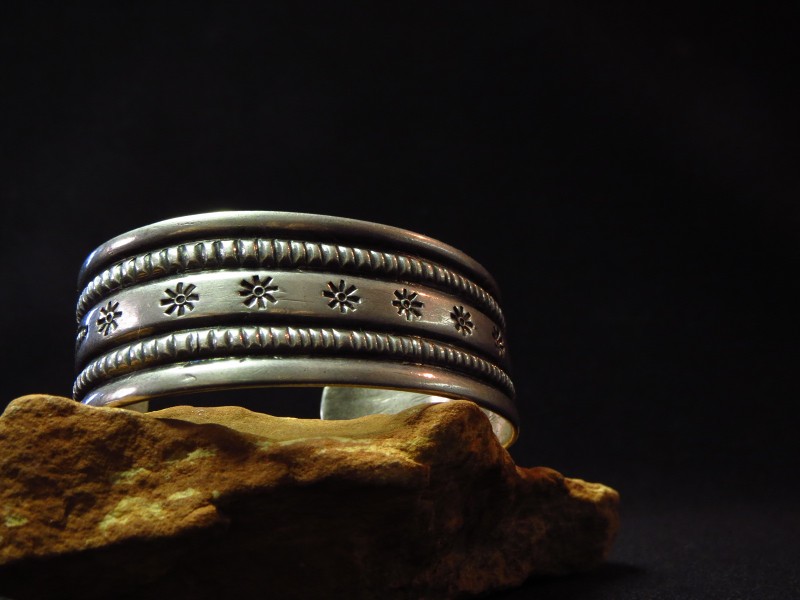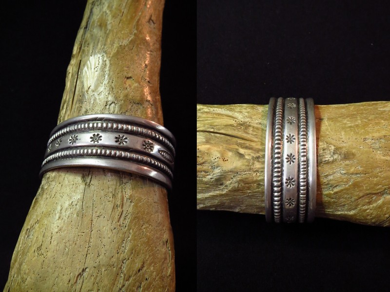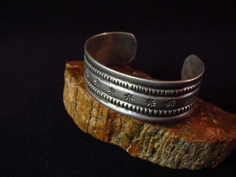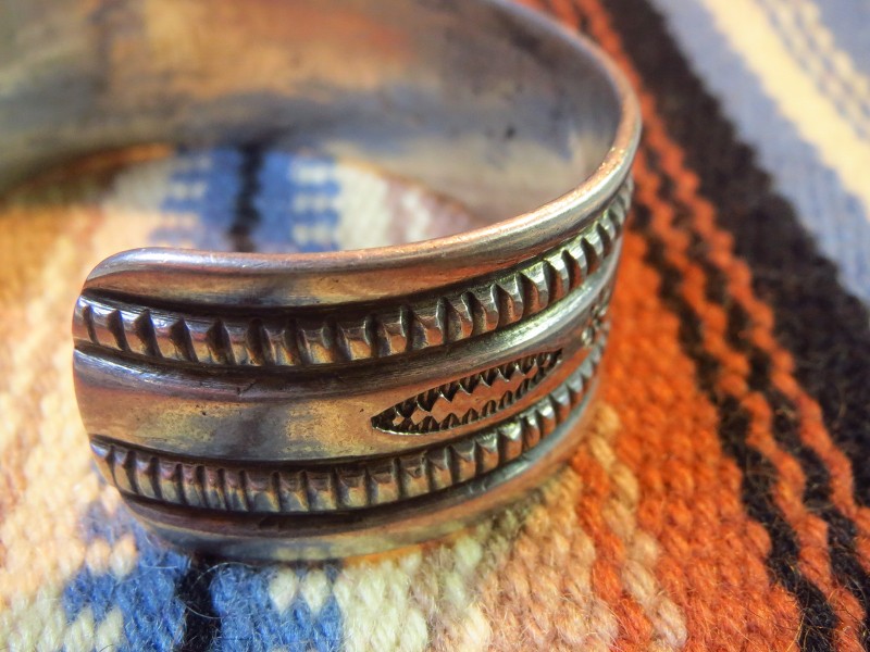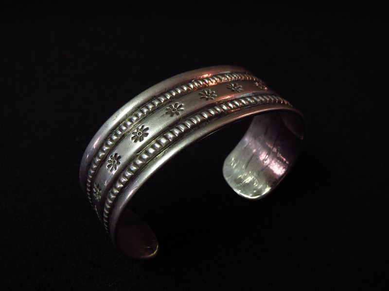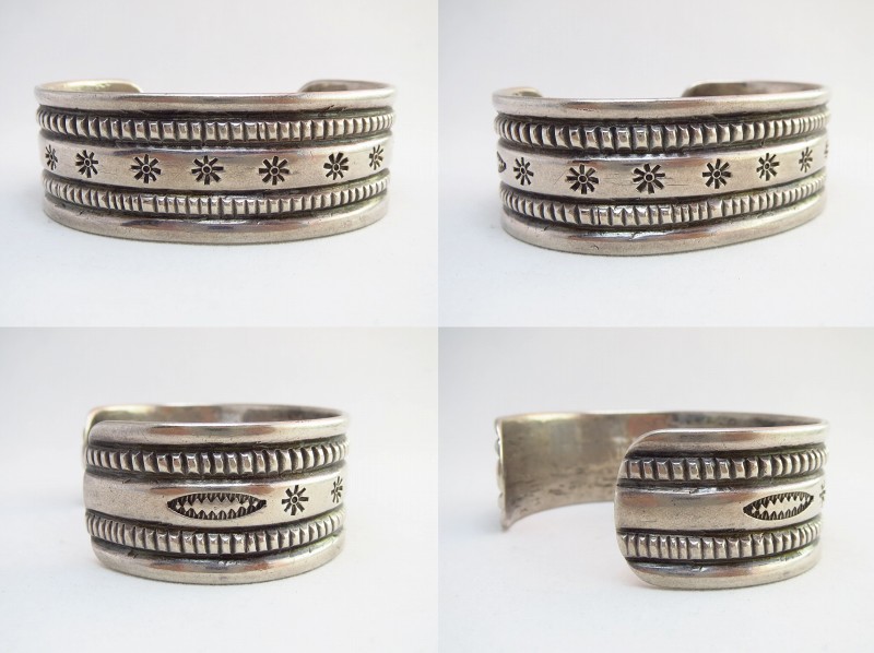 【NAVAJO】ナバホのアンティークジュエリー、インゴットシルバー(銀塊)から成形された滑らかな質感のバンド(地金)をベースに、力強く粗野な魅力を放つスタンプワークとファイルワークで構成されたアンティーク/ビンテージバングルです。