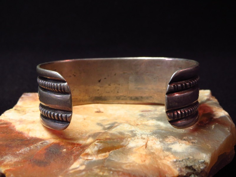 こちらの作品もインゴットから成形されたバンド(地金)や原始的ながらセンスを感じさせるスタンプワーク等、とてもクラシックな作品ですが、手間と高い技術力が必要なシルバーワークによって構成されています。それらオールドナバホの技術や理念を守る完成度の高いシルバーワークにより、武骨さとミニマルで現代的な印象を兼ね備えています。