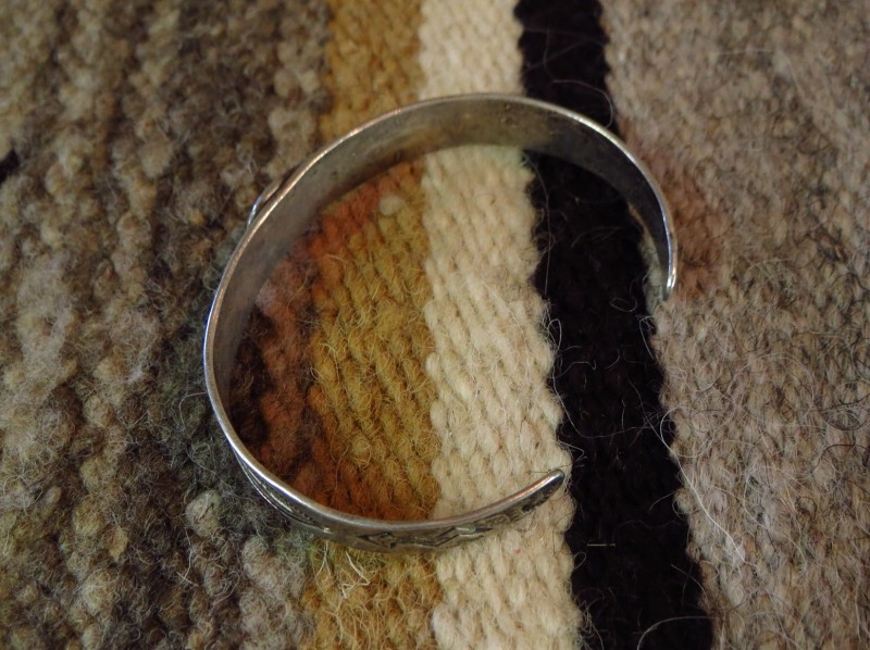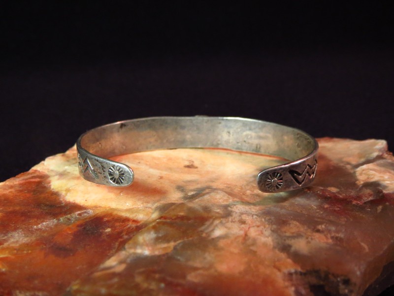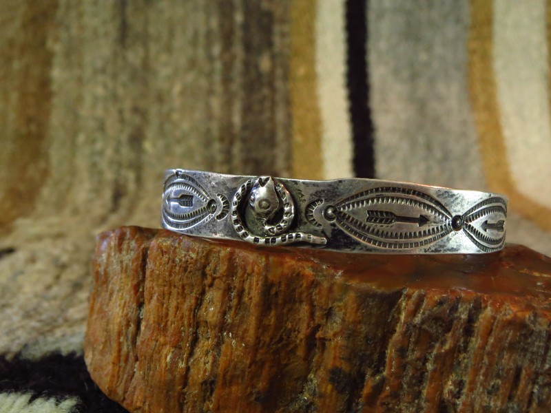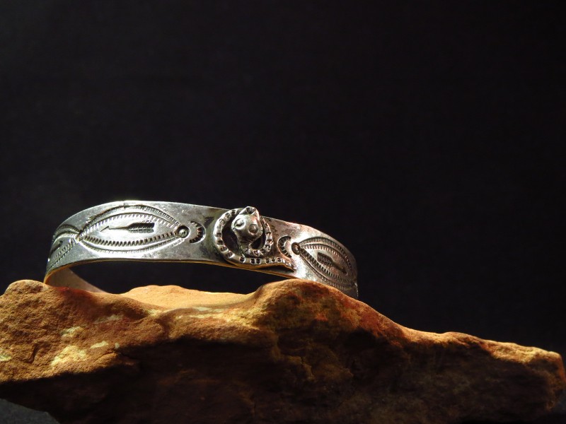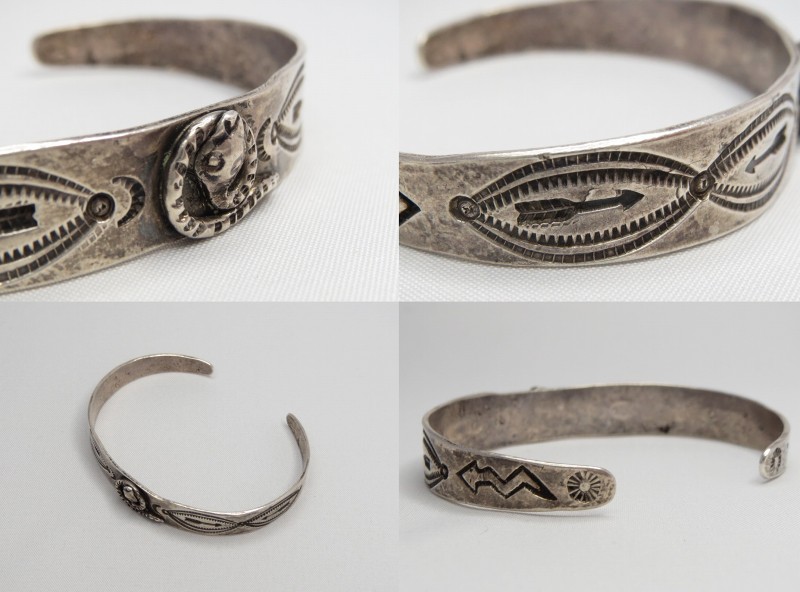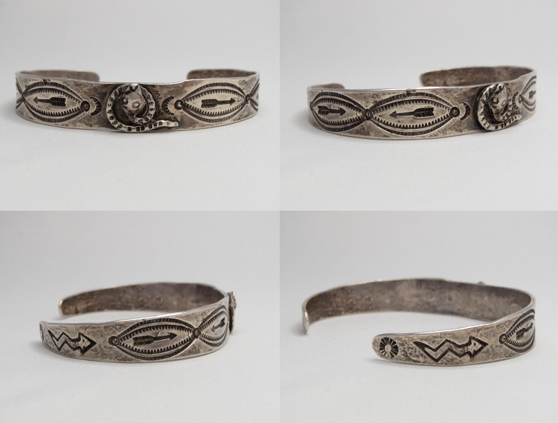 インゴットシルバー(銀塊)から成形されたバンド/地金をベースにし、センターには髑髏の様な毒のある顔の蛇/ラトルスネークがトグロを巻いた姿のアップリケ/パッチワークが施されています。小さなスネークですが頭部はハンマーワークによって立体的なドーム型に成形されており、細部にもこだわったシルバーワークが作品の奥行きをもたらしています。さらにサイド~ターミナルにもアローやライトニングスネーク、ホーガン等のスタンプが配され、全体に施されたスタンプワークなどによって表情豊かなピースに仕上がっています。これらに使用されているスタンプ(鏨)も全てハンドメイド・ハンドスタンプと思われ、量産化された作品に比べ粗暴にも感じられますが、その反面、オリジナリティーと高い完成度も持った作品です。
