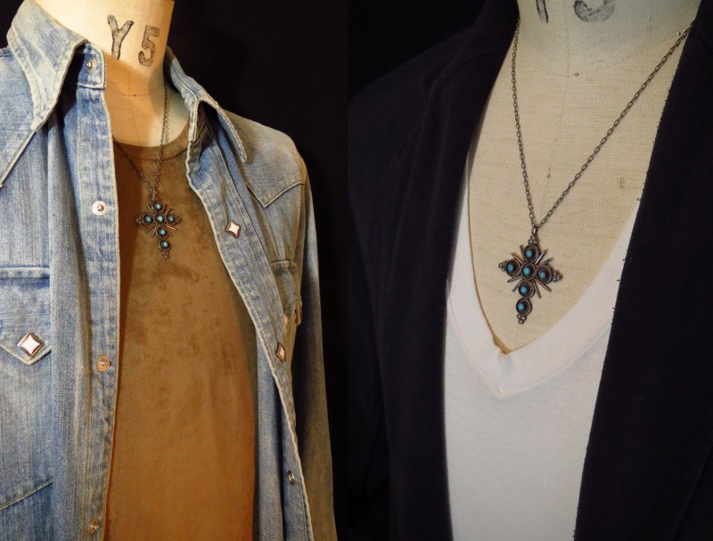 ズニジュエリーらしい繊細なシルバーワークで構成されたクロストップは静かな印象を持っていますが、独特の主張もあり、多くのスタイリングに馴染みやすいネックレス。女性的な雰囲気も感じさせるクロストップですが、程よいボリューム感やビンテージインディアンジュエリー特有の味わい深い表情は男性にも自然にフィットし、良いアクセントになってくれるアイテムです。