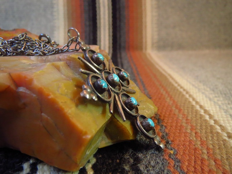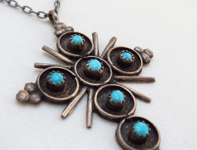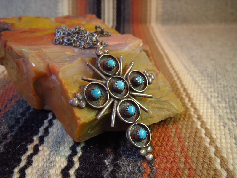 【ZUNI】ズニのビンテージジュエリー、ズニの伝統的なスタイルの一つであるサンバーストクロスデザインにターコイズがセットされたトップの作品。ナバホジュエリーとは違った印象の作品ながら、ビンテージインディアンジュエリーらしい表情を持つビンテージネックレスです。