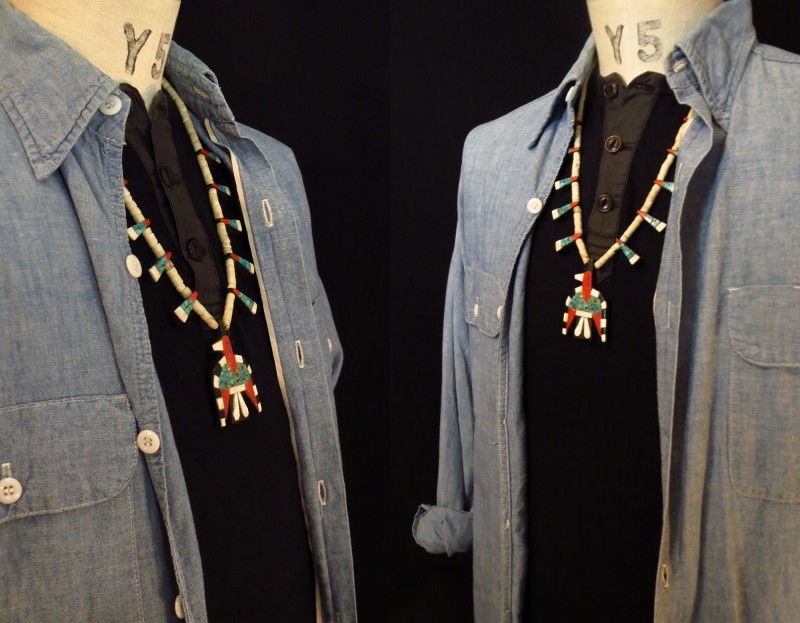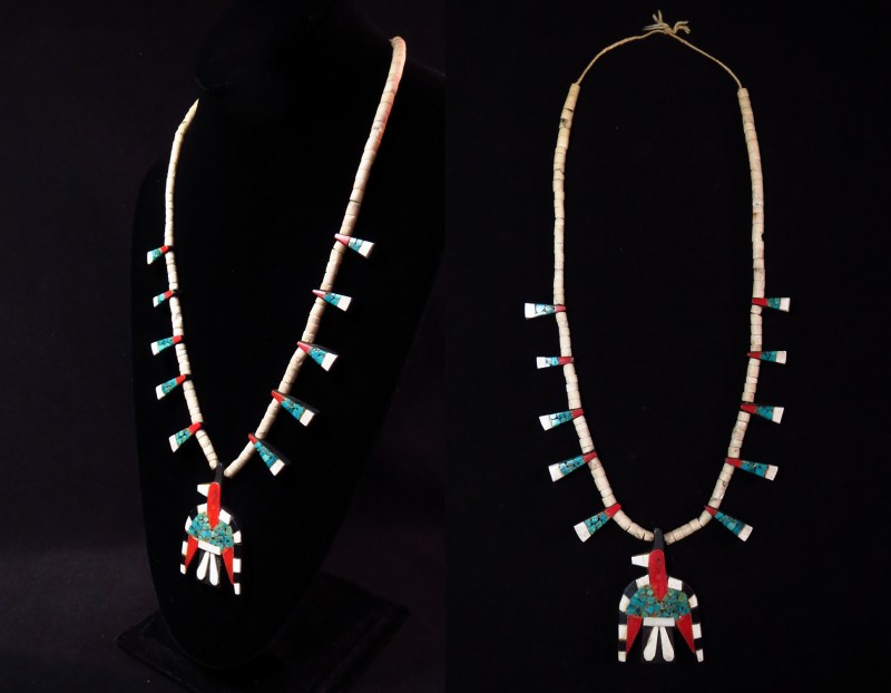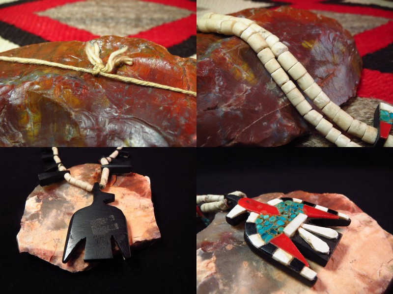中でも、この作品はサンダーバードのとぼけた表情等、可愛い印象と大胆な素材の構成による素朴な雰囲気が特徴的な個体です。ホワイト・ブラックを交互に配置することでモダンでグラフィカルな印象も与え、とても古い年代の伝統的な作品ですがポップでキャッチーなアクセントになってくれるネックレスです。