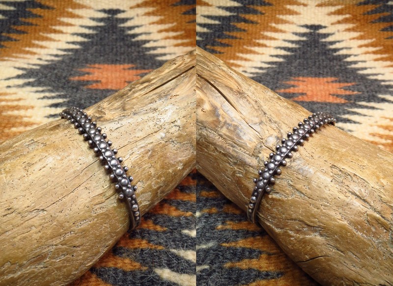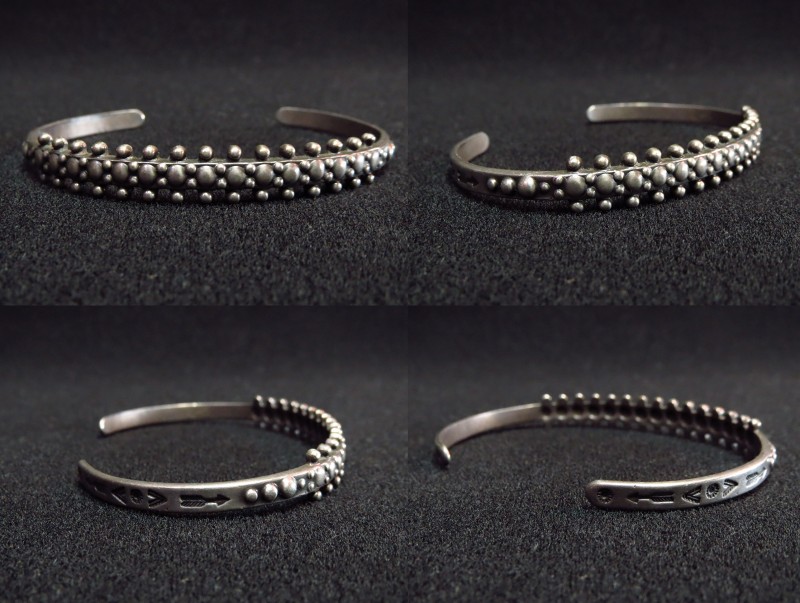 1930年代後半~1940年代頃に作られたとピースと思われ、細いバンドにおそらく『リポウズ/バンプアウト』と呼ばれる鏨(鉄製の金型ツール)の凸と凹を用いてシルバーを叩きだす細工によって、スタッズのような印象の小さなドロップ(ドット)が羅列され、その間にはとても小さなシルバードロップが構成されています。 さらに上下のエッジにも小さなシルバードロップが施されており、ターコイズは付きませんがズニの作品の様な造形スタイルを持っています。そして、サイド~ターミナルには、ツーリストアイテムらしいアローやホーガン等トラディッョナルなスタンプワークが刻まれています。制作の工程には機械が用いられているため、マシン&ハンドメイドのハイブリッドなピースであり、ある程度量産されたバングルですが現在では希少な物となっています。独創性のあるデザイン/造形はとても洗練された印象を作っており、長い年月を経た今見ても新鮮なピースです。