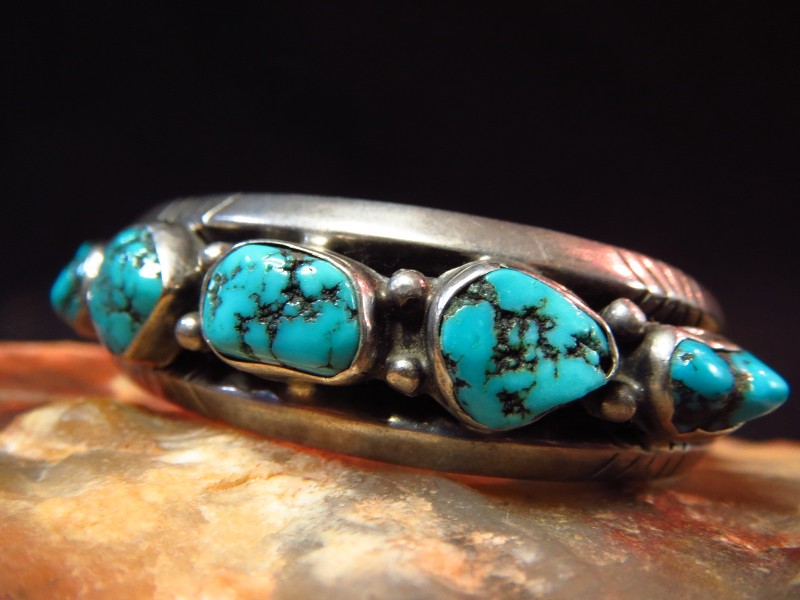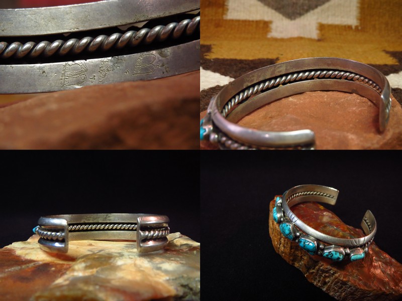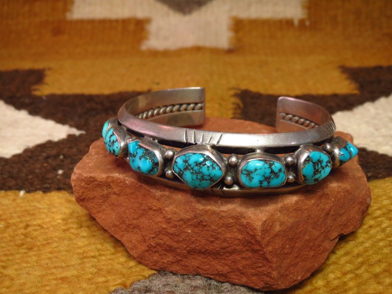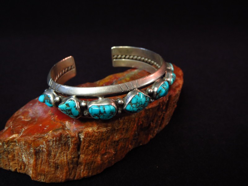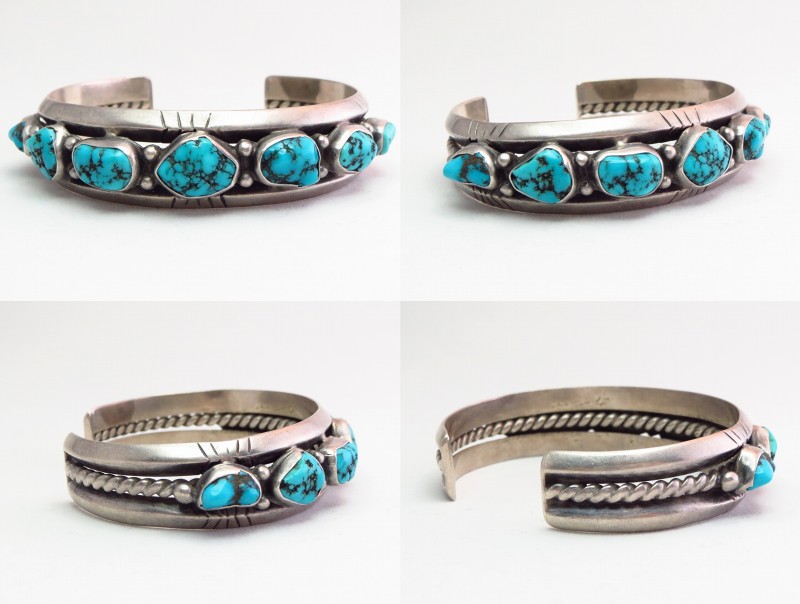 1960年代末以降の比較的新しい年代の作品ですが、ナバホジュエリーのオーセンティックな造形/デザインで構成されたトラディショナルなピース。上下2本の重厚なトライアングルワイヤーに挟まれるようにターコイズが7つセットされ、さらに2本のワイヤーを撚り合わせたツイステッドワイヤーによってバンド/地金が構成されています。このような石を連続して羅列した『ローワーク』と呼ばれるデザインは、ナバホのトラディショナルなスタイルの一つであり、武骨でワイルドな表情と構築的で重厚な印象を持っています。さらに、トライアングルワイヤーには、ライン模様が刻まれ、石の間と両サイドには14個ものシルバードロップ/シルバーボールが配されています。これらのシルバーワークもナバホの伝統的なディテールであり、ターコイズの存在感を活かしたシンプルな造形ながら、作品に奥行きと上質感を与えています。