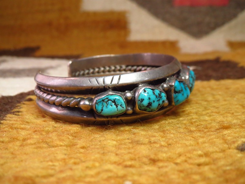 【NAVAJO】ナバホのビンテージジュエリー、伝統的なスタイルの重厚な造形に、7つのラフカットターコイズがセットされたビンテージバングルです。
