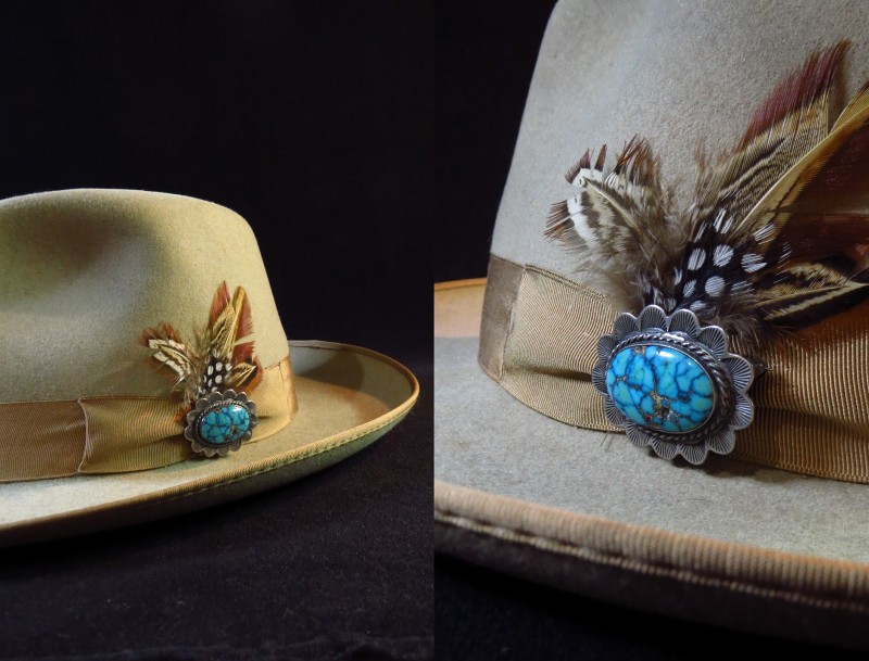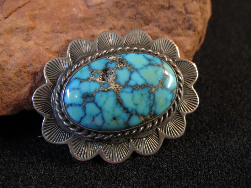 オーセンティックなナバホジュエリーのプリミティブで武骨な表情を持っていますが、ジェムクオリティーターコイズによってワイルドなだけでなく、品位も漂わせており、性別やスタイルを問わず多くの場面でとても効果的なアクセントとなってくれる作品です。ラペルや胸元にもフィットしますし、ハット等のワンポイント等にも使い勝手の良いピースです。