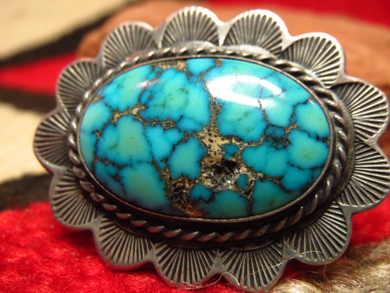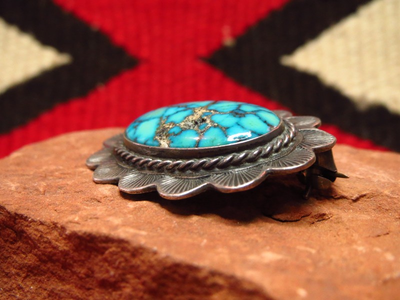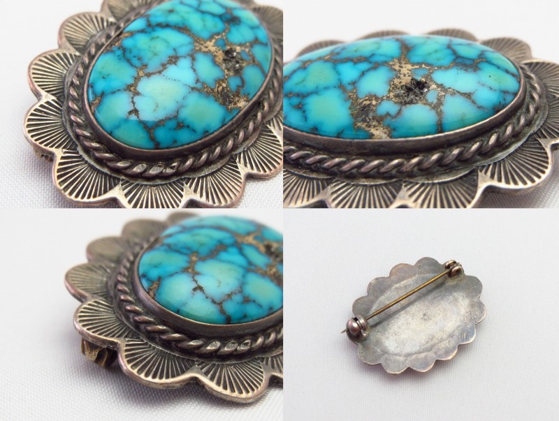 【NAVAJO】ナバホのビンテージジュエリー、オールドナバホジュエリーらしい武骨なコンチョをベースに素晴らしいクオリティーのターコイズがセットされたビンテージ/アンティークピンブローチです。