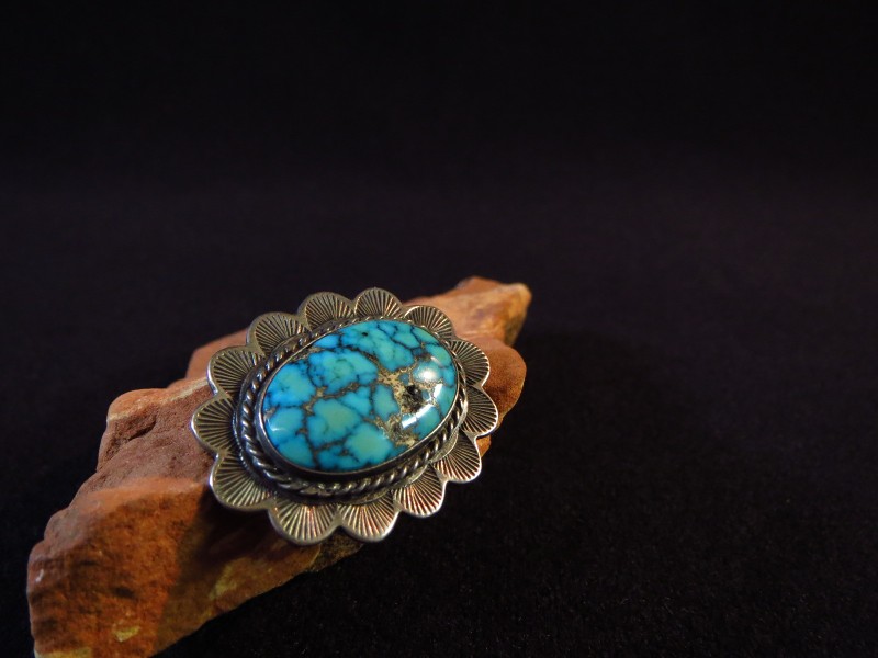 1940年代後半~1960年代に作られた作品で、おそらくインゴットシルバー(銀塊)から成形されたフラワーコンチョをベースにしたピース。大きくセットされたターコイズがメインに構成されており、石のベゼルには2本のワイヤーを撚り合わせたツイステッドワイヤーが施されています。また、『スキャロップドエッジ』(ホタテ貝)とも呼ばれるカットのエッジに合わせてビンテージ作品らしい高いクオリティーのスタンプ(鏨)によって細かな紋様が刻まれています。