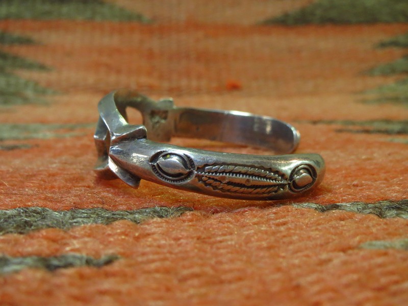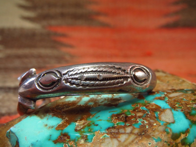 造形/デザインは、サンドキャストの作品としては比較的控えめなボリューム感に仕上げられており、ダイヤ型/菱形が形作られたフロント部分はトライアングルシェイプの断面でエッジーな表情を持っています。サイドからターミナルにかけてはハーフラウンドシェイプの断面に造形され、柔らかな曲面にナバホらしい武骨なスタンプワークが力強く刻まれています。