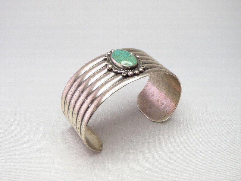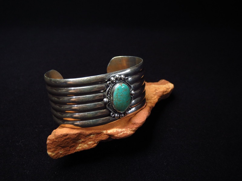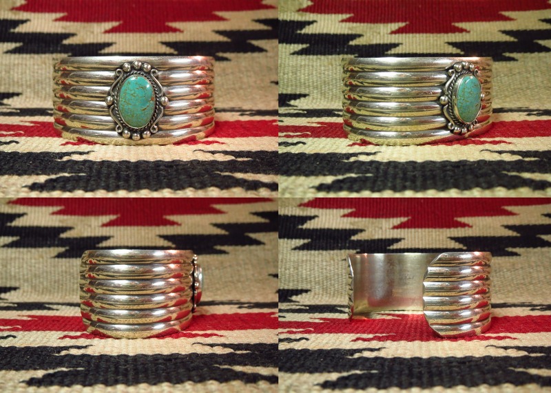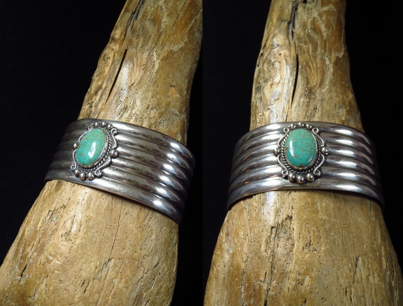 そのようなシンプルかつ洗練されたボーダーパターンに造形されたバンドをベースに、センターには美しいターコイズがセットされています。さらに、ターコイズのベゼルにはツイステッドワイヤー等の細かな装飾が施されており、そのデザイン/造形も1920年代~1940年代に活躍した著名なシルバースミスの作品を元にした流麗な装飾が構成されています。制作の工程には機械が用いられているため、マシン&ハンドメイドのハイブリッドなピースであり、ある程度量産されたピースですが現在では現存数の少ない貴重な物となっています。