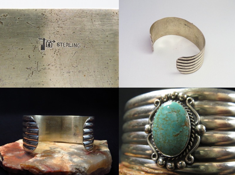 1940年代末~1960年代頃に作られたものと思われますが、こちらのバンド/地金に見られるようなバンデットスタイルのバングルは、1920年代以前から作られていた伝統的なスタイルの一つです。インディアンジュエリー作家として記録の残る最古の人物の一人であるホピ族の【Grant Jenkins】グラント・ジェンキンス(1909-1933)や【The Navajo Arts & Crafts Guild】通称ナバホギルドの作品、その代表を務めた【Ambrose Roanhorse】アンブローズ・ローアンホース(1904-1982)による作品、さらに、【Indian Arts & Crafts Board】(U.S.NAVAJO 2)= 【C. G. Wallace Indian Trader】にも残されています。また、もう少し新しい年代のメキシカンシルバージュエリーでも同様のスタイルは見つけることができ、【TIFFANY & CO】ティファニーでも制作されたデザインです。