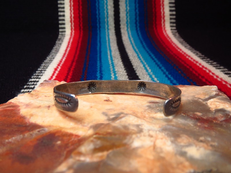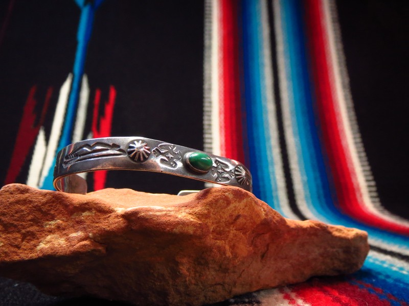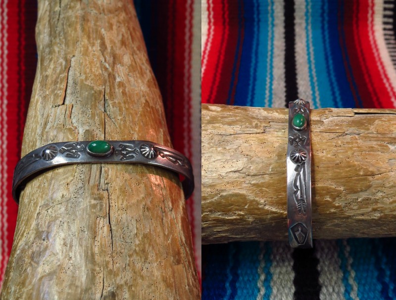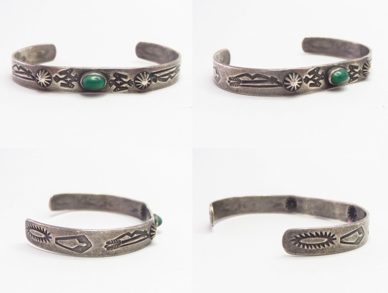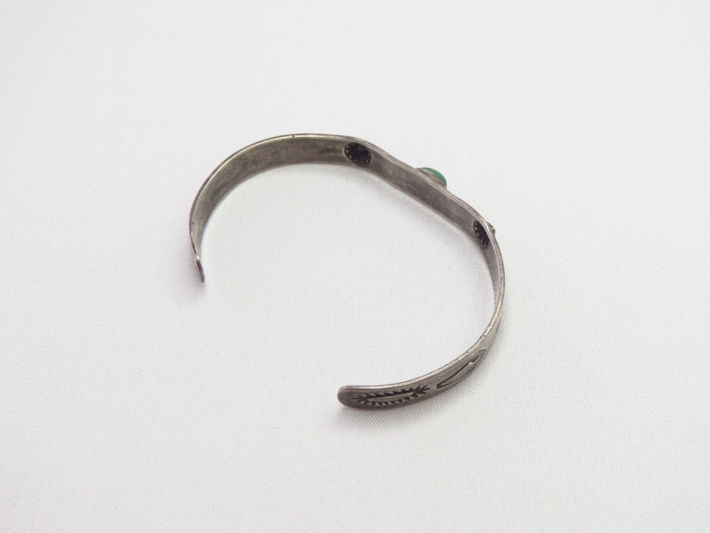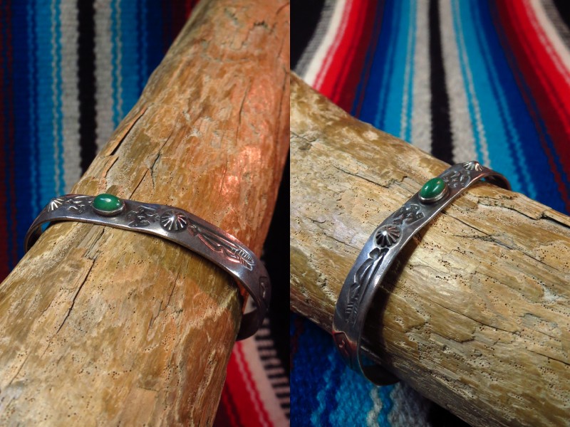 【NAVAJO】ナバホの【Tourist Jewelry】ツーリストジュエリーや【Fred Harvey Style】フレッド・ハービースタイルと呼ばれる、20世紀前半頃にアメリカ中西部の観光客向けに制作されたスーベニアアイテム(土産物)の一つ。センターにグリーンターコイズがセットされ、サンダーバードやアローなどのスタンプワークが刻まれたとても小さいサイズのアンティーク/ビンテージバングルです。