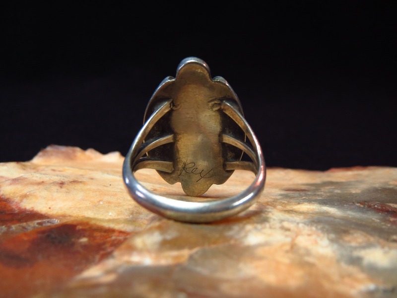裏面には、ホールマーク(サイン)と思われるスクラッチが施されていますが、作者などは不明となっています。ただし、ナバホジュエリーの伝統的な技術やディテールを受け継ぎながらモダンで繊細な美しさを持つそのデザインは、1927年に創業したサウスウエストスタイルのシルバージュエリーショップである【Thunderbird Shop】を経営したイタリア人のジュエリー作家【Frank Patania Sr.】フランク・パタニア(1899-1964)の影響を感じさせる作品です。