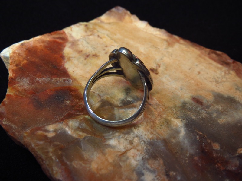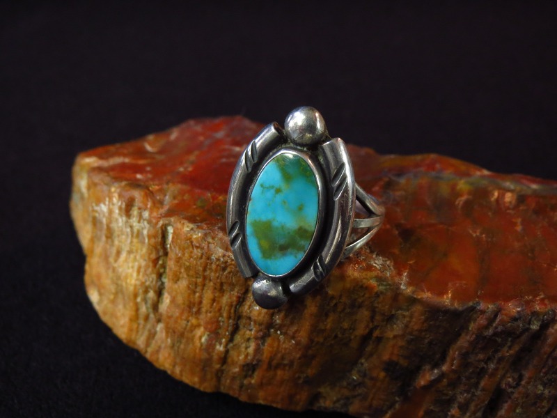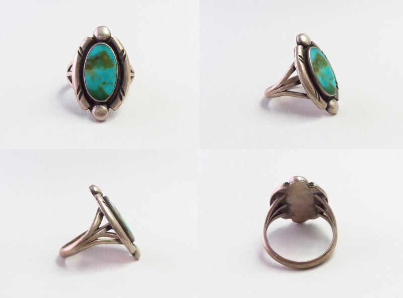 シャンク(地金)は、丁寧なシルバーワークによってフロントが3本に割り開かれた『スプリットシャンク』と呼ばれるトラディショナルなスタイルに造形されています。そこに縦長のフェイスが構成され、オーバルカットの美しいターコイズがセットされます。ターコイズの両サイドにはハーフラウンドワイヤーが石のシェイプに添って施されており、ライン模様が刻まれていることでナバホジュエリーらしいアクセントとなっています。さらに、上下にはシルバーボールが配されており、クリーンでシンプルなシルバーワークですが、高い技術を持った作者を想像させる作品です。