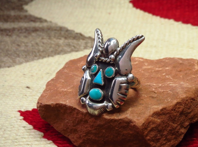 重厚なシャンクは、力強いシルバーワークによって2本に割り開かれ、『スプリットシャンク』と呼ばれるナバホのトラディショナルなスタイルに造形されています。そこに迫力のあるホピ族のマスクがフェイスとして構成されており、ハンマーワークによって立体的な丸みが成形されたパーツによって奥行きと動きのあるマスクが作り上げられています。さらに、ターコイズによって目や鼻などが表現され、一部にはツイステッドワイヤーやスタンプ、シルバードロップ(ボール)による装飾が施されています。
