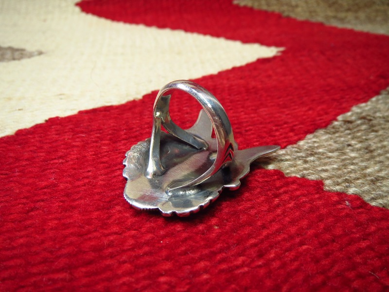 すべてナバホジュエリーの伝統的なディテール/シルバーワークにより構成されていますが、高度な技術力や造形センスによって突出した独自性とジュエリーとしての造形美、さらに作者のアイデンティティーを感じさせるリングに仕上がっています。