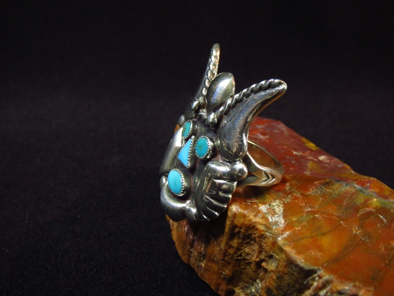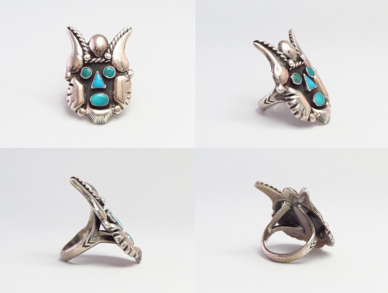 独自性のあるモチーフと伝統的な技術や製法を踏襲したビンテージインディアンジュエリーの素朴でエスニシティーな味わいも感じられ、立体的な構造と迫力のあるデザイン/造形によって特別な存在感を放つリングです。