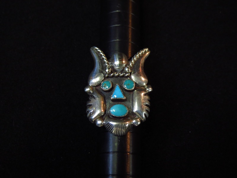 1950年代前後のピースと思われ、インディアンジュエリーの世界に多くの新しい様式や技術を持ち込んだFrank Pataniaらしく、ホピ族の儀式において用いられるマスクをモチーフとした作品。同作者は他にもブードゥー教のシャーマンドクター/呪術医をモチーフとしたピース等を残しており、自信の出身地であるヨーロッパの美術・文化様式だけでなく、世界中の文化や美意識をインディアンジュエリーの中に溶け込ませていきました。