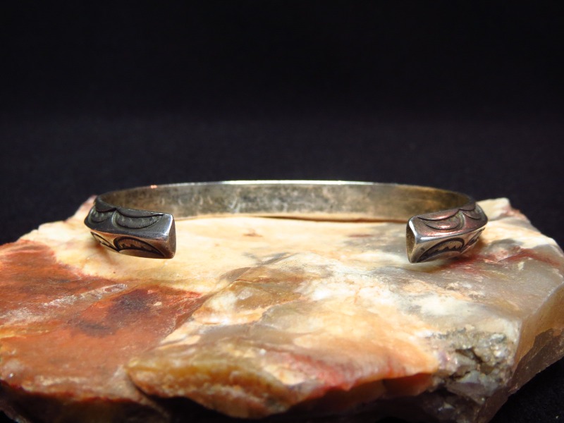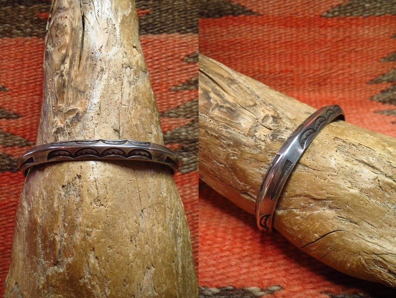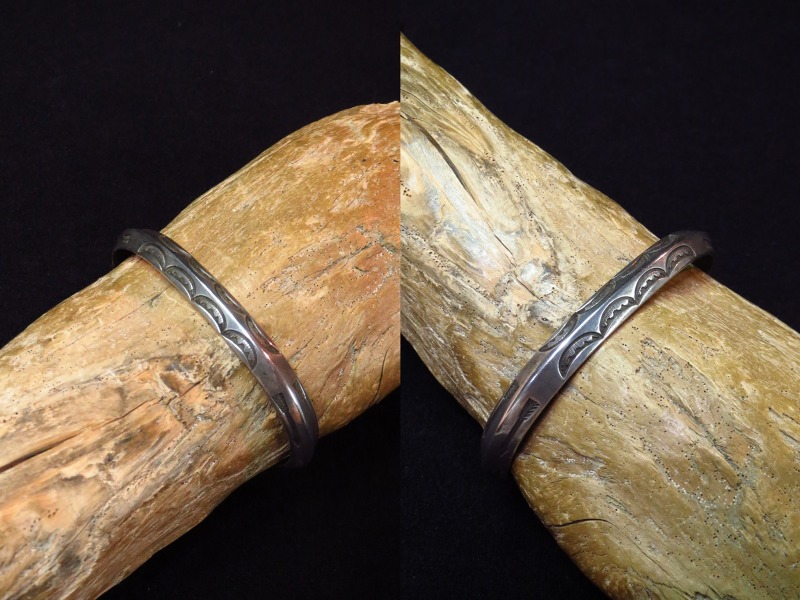 プリミティブな製法と、古典期から続く伝統を継承する造形スタイルの作品であり、その製法や力強いスタンプワーク等によって、ビンテージインディアンジュエリーらしい武骨な雰囲気と渋い印象が与えられています。 また、少しサイズが大きい為にバンドの幅が少し細く見えますが、実寸は7.6㎜とトライアングルワイヤーのバンドとしては、最大級(9.0㎜程度)に次ぐ太さを持っています。