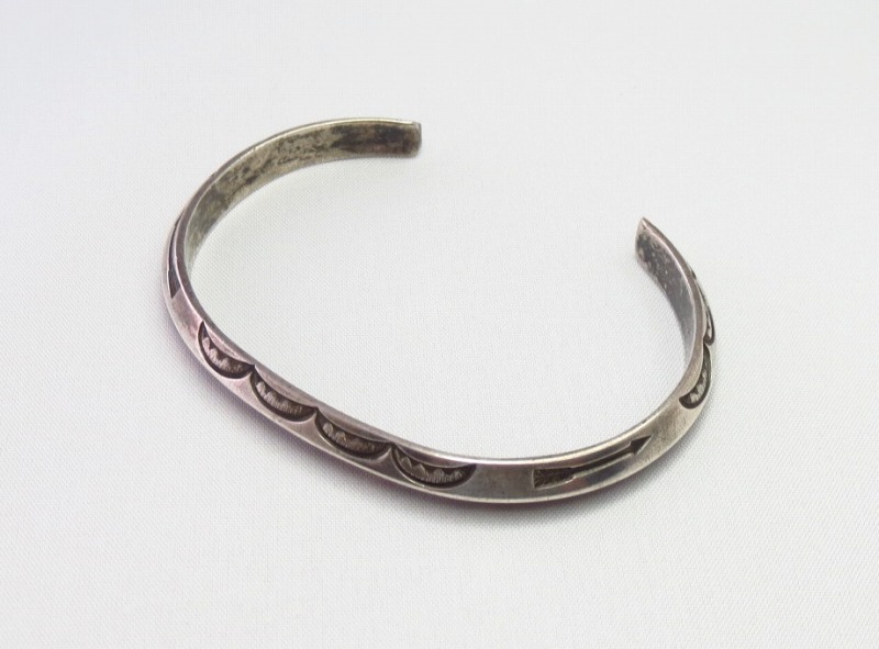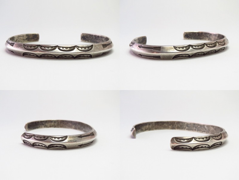 1920年代後半~1940年代前半頃に制作されたピースと思われ、重厚でアンティークらしい質感や味わい深いスタンプワークが特徴的なピースです。現代においてもナバホのオーセンティックなスタイルの一つとしてトライアングルワイヤーをベースにした作品は数多く制作されていますが、こちらの作品は現在制作されている作品群のソース/源流となったピースであり、そのプリミティブな製法は、既製のトライアングルワイヤーを使った現代の作品群とは違った表情や迫力を持っています。