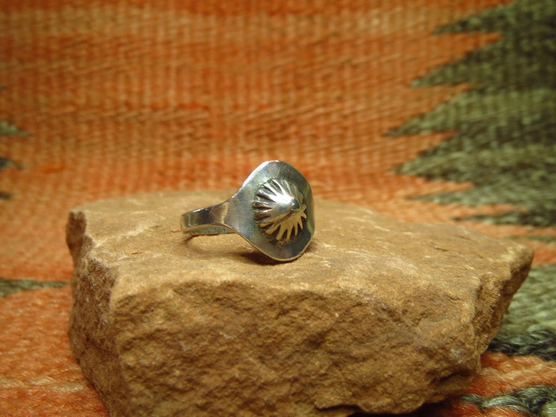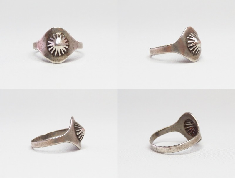 【NAVAJO】ナバホの【Tourist Jewelry】ツーリストジュエリーや【Fred Harvey Style】フレッド・ハービースタイルと呼ばれる、20世紀前半頃にアメリカ中西部の観光客向けに制作されたスーベニアアイテム(土産物)の一つで、センターにシェルコンチョのリポウズ/バンプアウトが施されたとてもシンプルなアンティーク/ビンテージリングです。