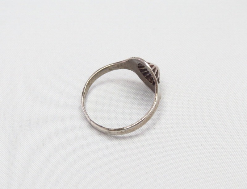 1930年代後半~1940年代当時に作られたピースで、ツーリストジュエリー/スーベニアアイテムらしい造形/デザイン。控えめなボリューム感と独特な存在感を持ったリングです。シェイプはセンターが広く内側が細いシャンクに造形されることで少しクラシックな印象を感じさせます。そのセンターに、鏨(鉄製の金型ツール)の凸と凹を用いシルバーを叩きだすことで立体的な凹凸を作るリポウズ/バンプアウトと呼ばれる技術により貝殻を起源に持つ造形が施されており、立体的な表情が与えられています。