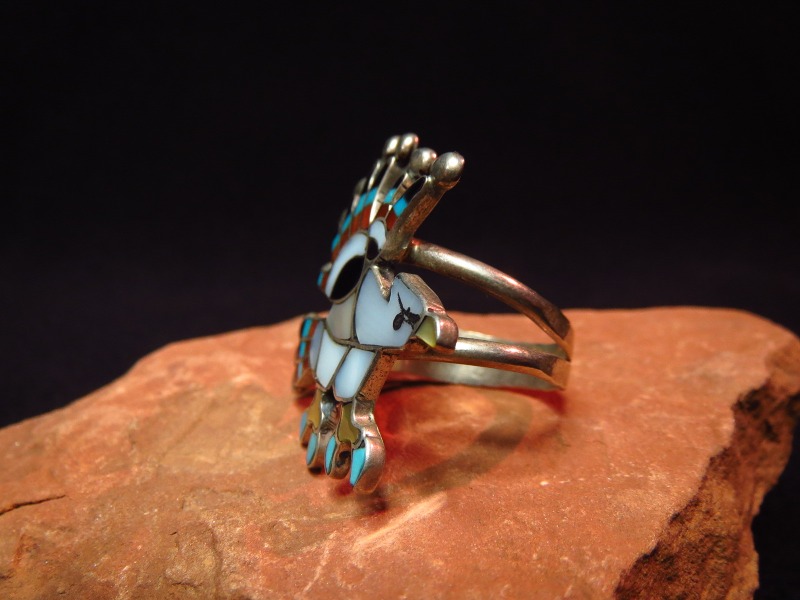 【ZUNI】ズ二のベテラン作家【Charlotte Dishta】シャーロット・ディシタの作品で、インレイで構成されたセンスの良いカラーリングと、とても躍動感のあるイーグルデザインが印象的なリングです。