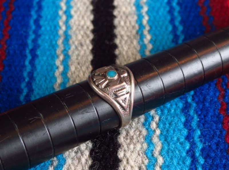 それほど大きなボリューム感のリングではありませんが、クラシックなシガーバンド(葉巻に巻かれている帯のこと。現在は、ブランドが確認できるデザインが描かれているが、もともとは手袋や手に葉巻によるシミが付くことを防ぐ為に考案された帯)のシェイプに成形されたシャンクのフェイスにサンダーバードが施されており、センターには小さなターコイズがセットされています。さらに両サイドにはアローヘッドなどが配されており、ツーリストジュエリーらしいチープな表情とアンティーク独特の重厚感を併せ持ったピースとなっています。