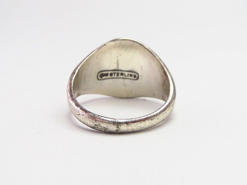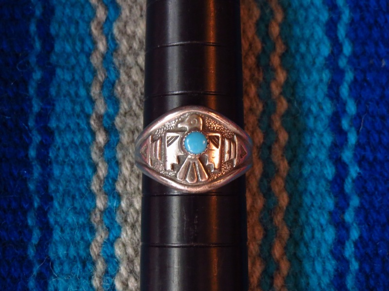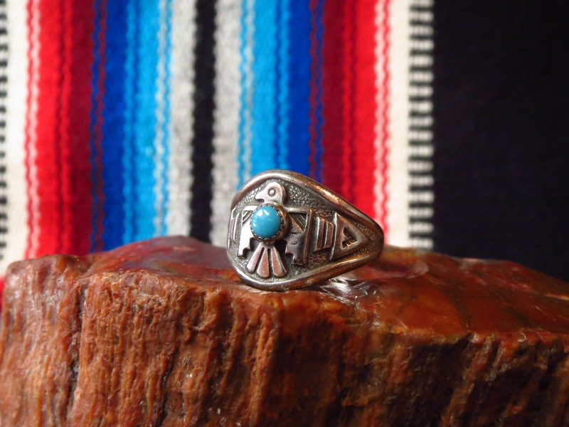 ナバホの伝統的なモチーフ、サンダーバードがメインになったフレッド・ハービースタイルや【Tourist Jewelry】ツーリストジュエリーと呼ばれる観光客向けに生産されたスーベニアアイテムらしいキャッチーな印象のリングで、1940年代末~1960年代頃の物ですが、同じデザインの作品が40年代以前から作られていました。