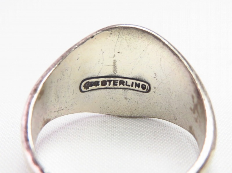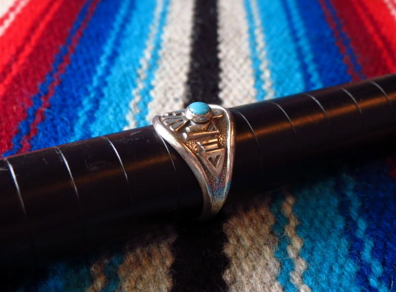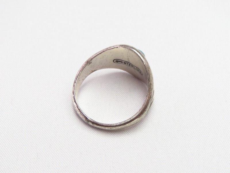それほど大きなボリューム感のリングではありませんが、クラシックなシガーバンド(葉巻に巻かれている帯のこと。現在は、ブランドが確認できるデザインが描かれているが、もともとは手袋や手に葉巻によるシミが付くことを防ぐ為に考案された帯)のシェイプに成形されたシャンクのフェイスにサンダーバードが施されており、センターには小さなターコイズがセットされています。さらに両サイドにはアローヘッドなどが配されており、ツーリストジュエリーらしいチープな表情とアンティーク独特の重厚感を併せ持ったピースとなっています。