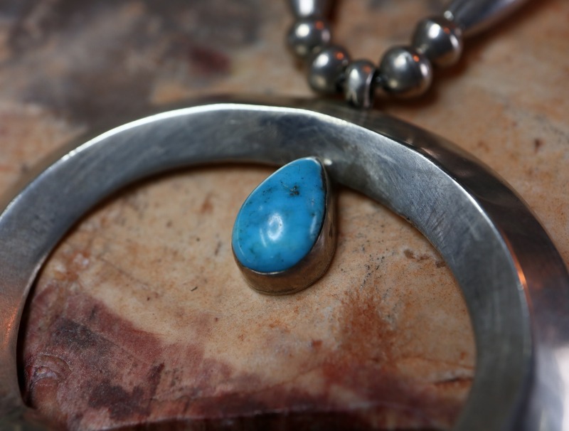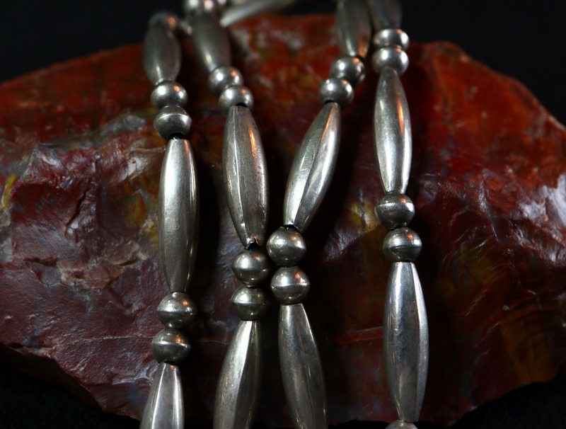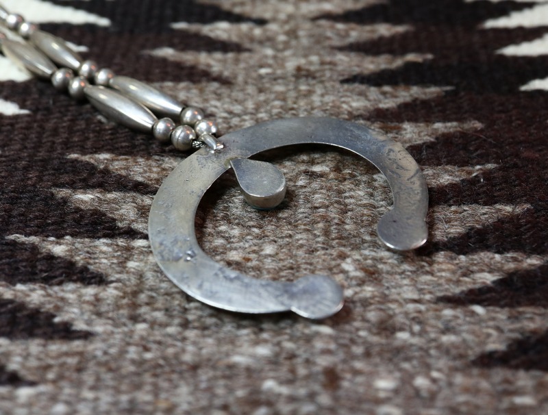 1960年代以降の作品ですが、アーリーナバホのクラシックな造形スタイルを受け継ぎ、ハンドメイドインディアンジュエリーのプリミティブな造形や武骨な表情を残しながらもクリーンでモダンな印象に仕上げられたネックレスです。