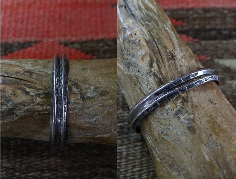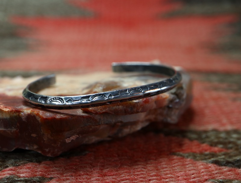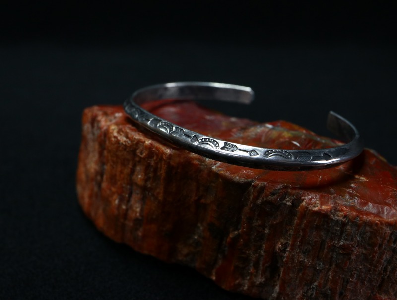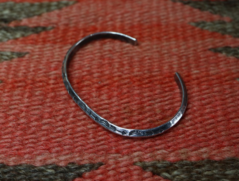 1930年代~1940年代頃に作られた作品と思われ、フレッド・ハービースタイルとも呼ばれるツーリストジュエリーながら、全ての工程がハンドメイドで制作されています。トラディショナルな造形の一つであるトライアングルワイヤーをバンド/地金にした作品で、細い幅の上下に細かくスタンプワークが施されたピースです。ナローな幅の作品ですが、アローやベイナー等の文様を刻むスタンプ(鏨)は、アンティーク作品独特なクオリティーを持ち、古い作品特有の迫力とプリミティブな雰囲気を宿しています。また、シルバーの肌も長い経年により少し暗い色に変色し、ビンテージらしい風格を感じることが出来る作品となっています。