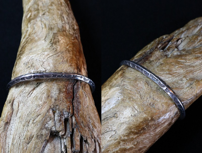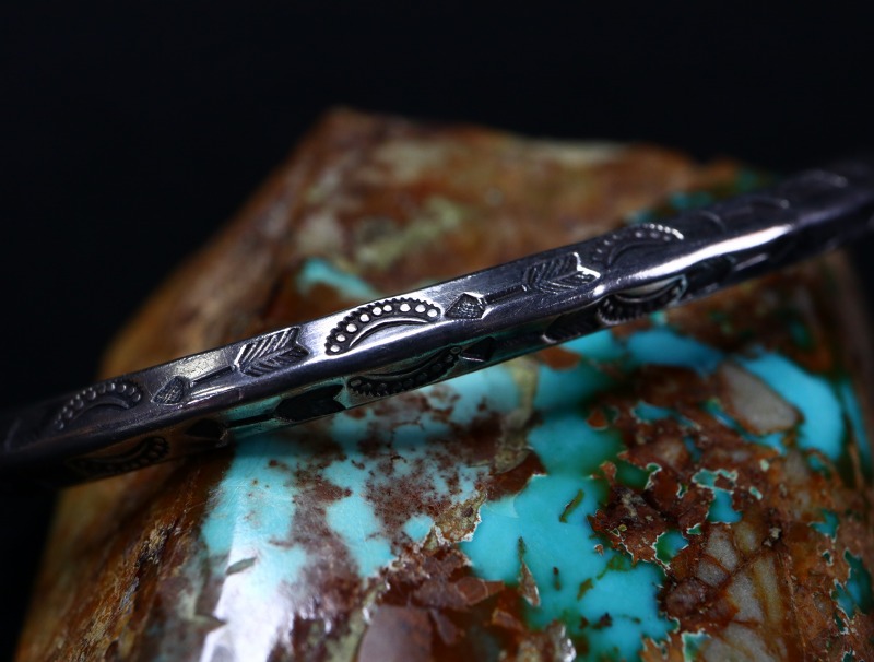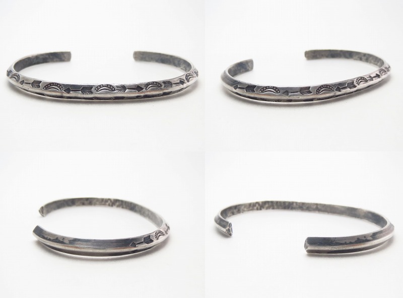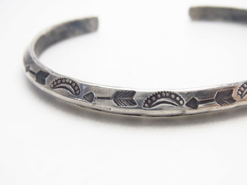 【NAVAJO】ナバホか【PUEBLO】プエブロの職人による作品で、【Tourist Jewelry】ツーリストジュエリーと呼ばれる20世紀前半頃に観光客向けに生産されたスーベニアアイテムの一つ。ナローなトライアングル(竜骨型)ワイヤーをベースに、細かくも力強いスタンプワークによってアロー等が刻まれたアンティーク/ビンテージバングルです。