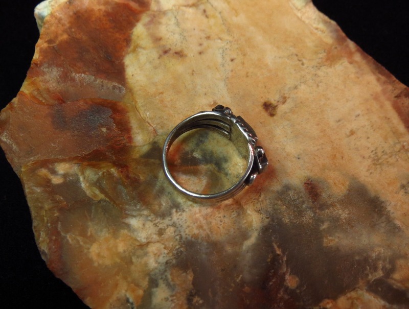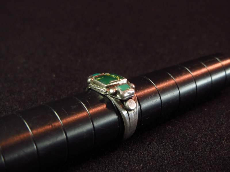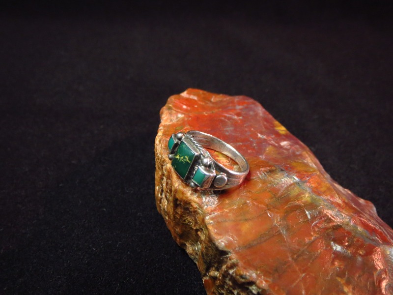 立体的で奥行きを持ったシルバーワークと、素朴でシックなスクエアカットのグリーンターコイズによって多くのスタイルにナチュラルに馴染みやすく女性だけでなく男性のピンキーリングとしてもフィットするリングです。
