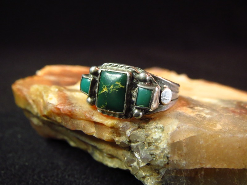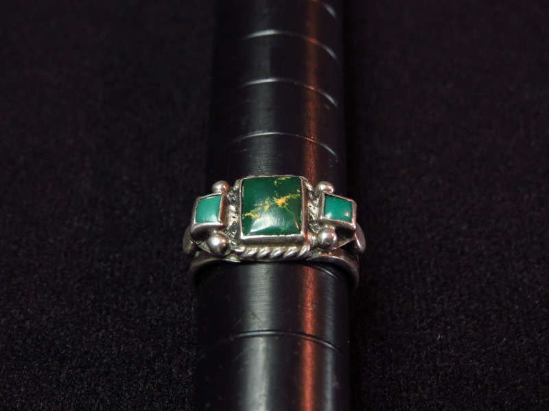 【NAVAJO】ナバホのアンティークジュエリー、細かく丁寧なシルバーワークで構成され、大きさの異なった3つのスクエアカットターコイズがセットされた作品。伝統的な技術で形作られ、クラシックな印象とナバホジュエリーらしいハンドメイドの味わいを併せ持ったビンテージ/アンティークリングです。