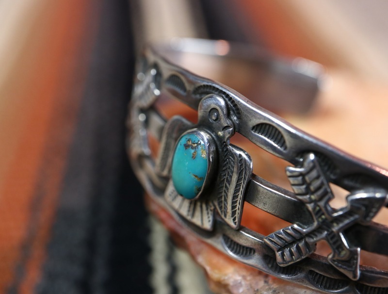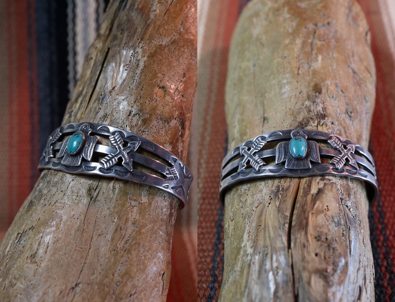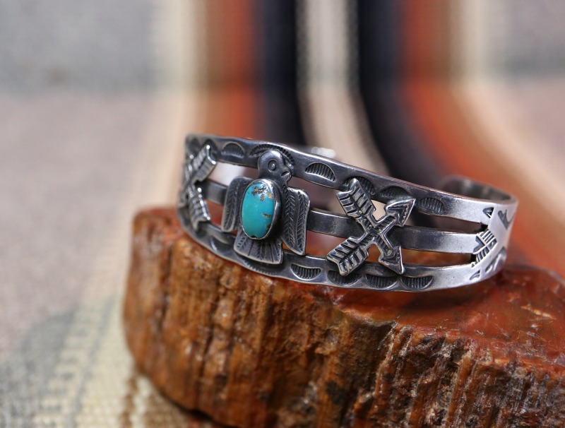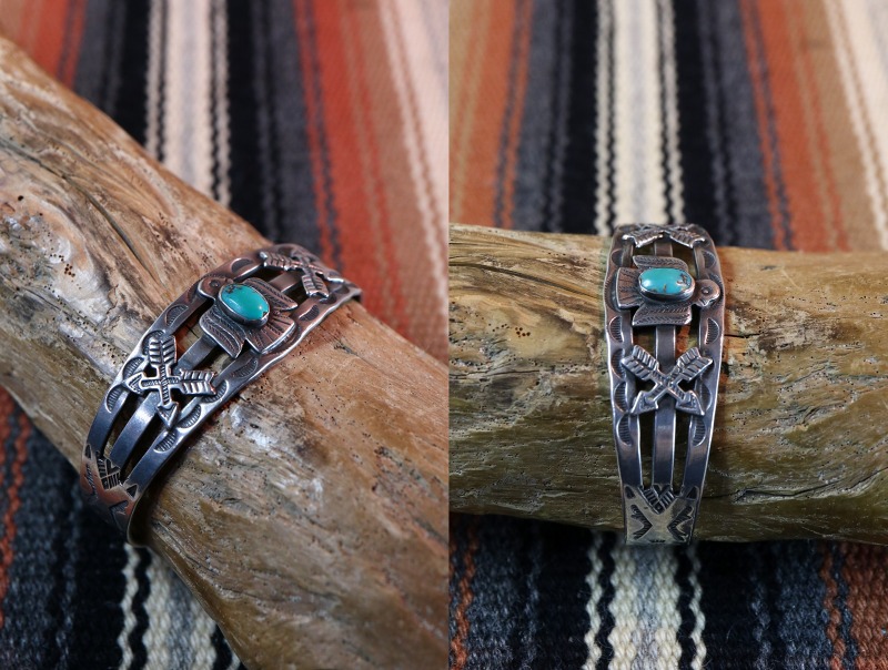 1930年代後半~1940年代製と思われ、スプリットされたバンド/地金をベースに、センターにはターコイズがセットされたサンダーバードがアップリケされ、その左右にもクロスアローズがアップリケされています。モチーフや構成はツーリストジュエリーらしいキャッチーなイメージですが、ツーリストジュエリーの中では比較的厚みと重量感があり、しっかりとした造りのピース。さらに、バンドのサイドからターミナルにかけてもサンマークやアロー等のスタンプワークが配されています。一部の工程には機械が用いられているため、マシン&ハンドメイドのハイブリッドなピースですが現在では現存数の少ない貴重な物となっています。