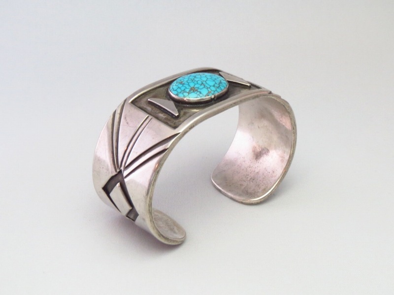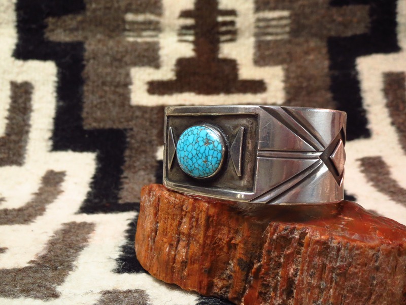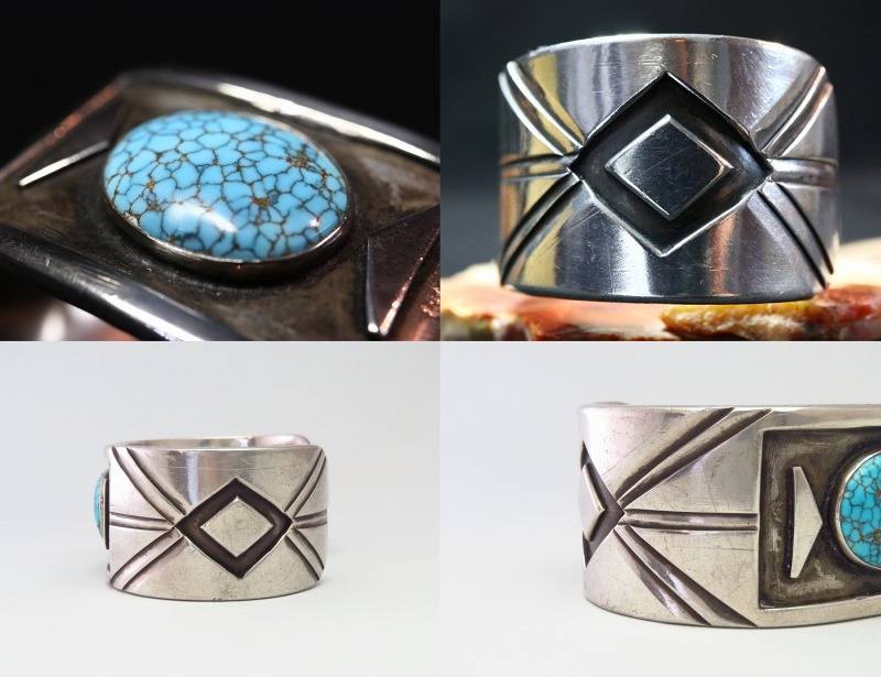 フロント部分に長方形のフレームのようなデザインが施され、ターコイズの美しさを強調しています。その石の左右には、アクセントとなる三角形のシルバーが配されており、バンドのサイドに構成されたデザインと呼応しています。両サイドには大胆な菱形がオーバーレイで描き出されており、それを中心にしたバースト/放射状のライン模様がスタンプワークによって力強く刻み込まれています。大変シンプルながら独創性を持ったバングルに仕上げられており、作者の突出した造形センスを感じ取ることが出来る作品です。また、こちらのような造形スタイルを持った作品は、『UITA』の刻印が施された【the United Indian Trader's Association】の作品で確認されていますが、非常に数が少なく貴重なピースとなっています。
