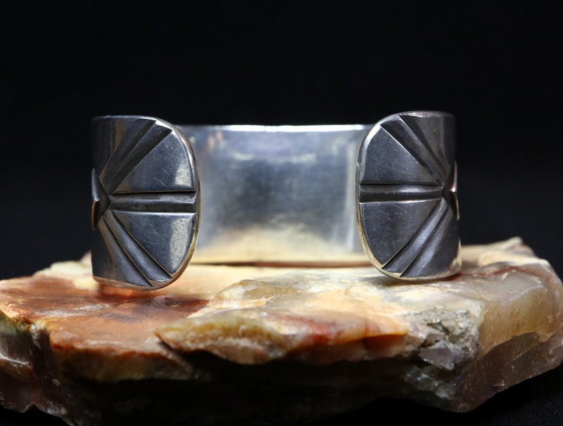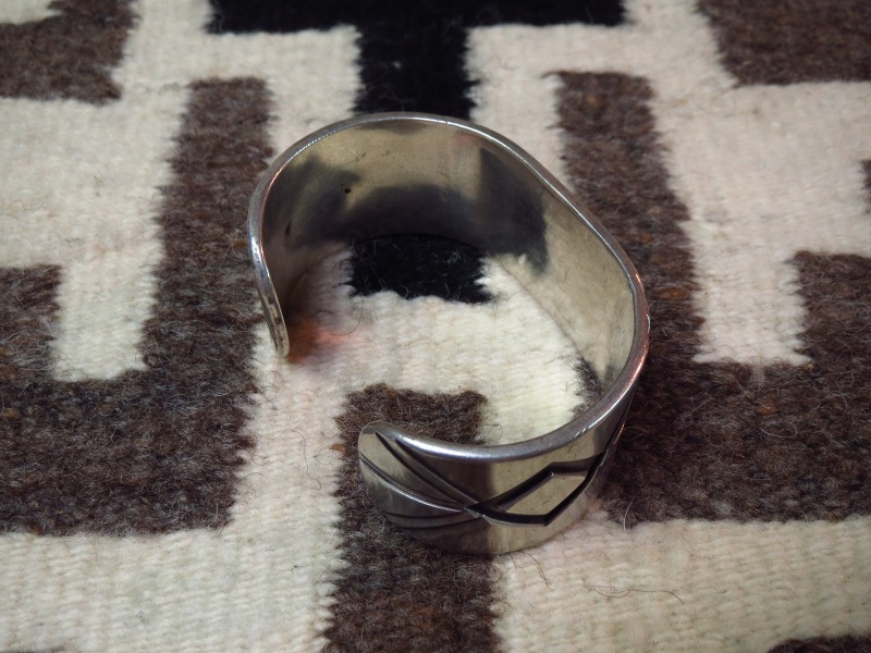 1950年代~1960年代頃に作られたピースと思われ、インゴットシルバー(銀塊)から成形されたプレート状のシルバー2枚を重ねることで<80g>を超える非常に重厚なバンドが構成されています。それらの重ねられたシルバーの片側に、切り抜き部分を作ることで立体的なデザインを形作る『オーバーレイ』と呼ばれるシルバーワークにより、大胆なデザイン/造形が施されています。オーバーレイ技法は、現在ではホピジュエリーにおいて代表的な技術として定着していますが、こちらが制作された当時には、まだホピ以外の作家にも新しい技術の一つとして取り入れられていました。こちらの作品もホピの作家によって制作された可能性もありますが、おそらくナバホの作家が制作した作品である可能性が高いピースです。