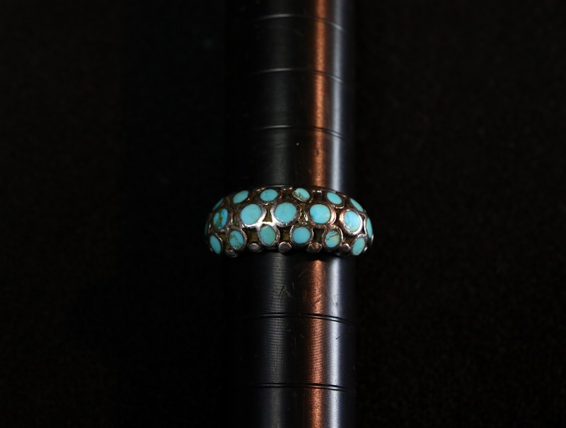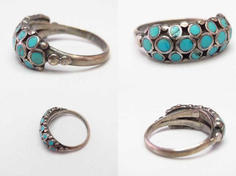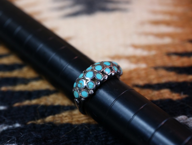 【ZUNI】ズニのビンテージジュエリー、『ディシュタスタイル』と呼ばれる小さなターコイズインレイを規則的に配列する事によって構成された作品。高い技術力を感じさせる全体に丸みのある造形が特徴的なビンテージリングです。