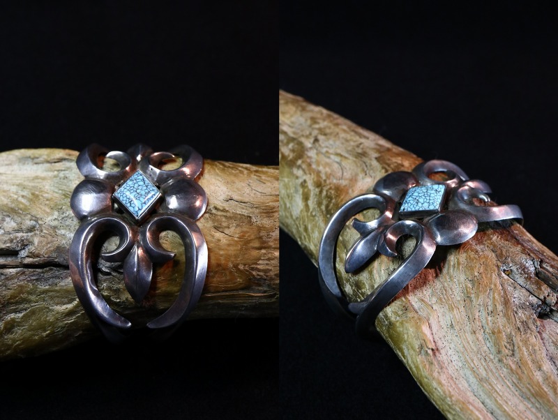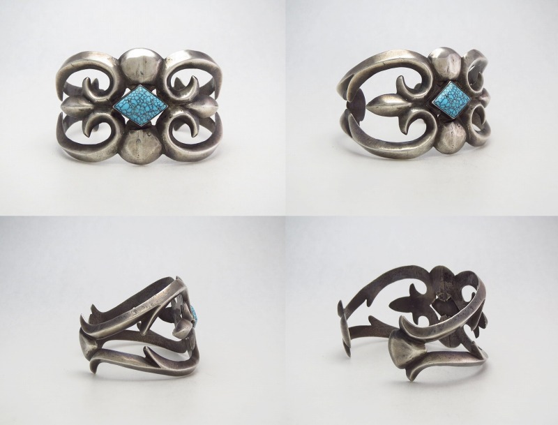 プリミティブな技術で作り上げられたビンテージジュエリーであり、古い作品特有の武骨で重厚な質感を持ちすが、上質なターコイズや洗練されたデザイン/造形等によって、エレガントで落ち着いた印象も併せ持っているようです。またそれが、伝統工芸品として作られたシルバージュエリーをウェアラブルアートとしても評価できる作品へと昇華しているようです。