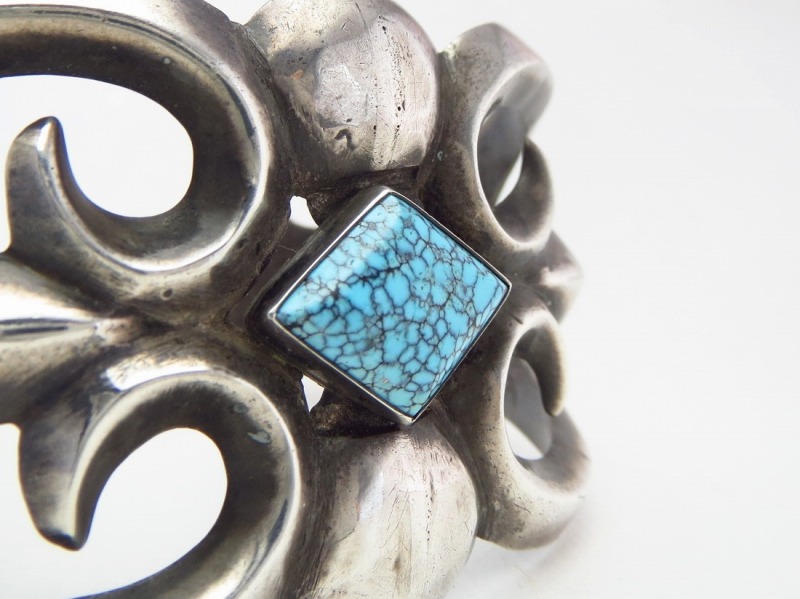 デザイン/造形は現代的な印象も受ける作品ですが、こちらの様なシェイプデザインは古く見られる伝統的なスタイルです。オベリスク(唐草)模様のような流麗な曲線で構成され、インディアンジュエリー古典期のスタイルを踏襲しながらもモダンな印象と高い完成度が与えられています。そして、センターには澄んだ水色に美しいブラックウェブの入るナンバーエイトターコイズがマウントされており、そのターコイズがダイヤモンド/ランバスシェイプにカットされていることも本作の大きな特徴となっています。