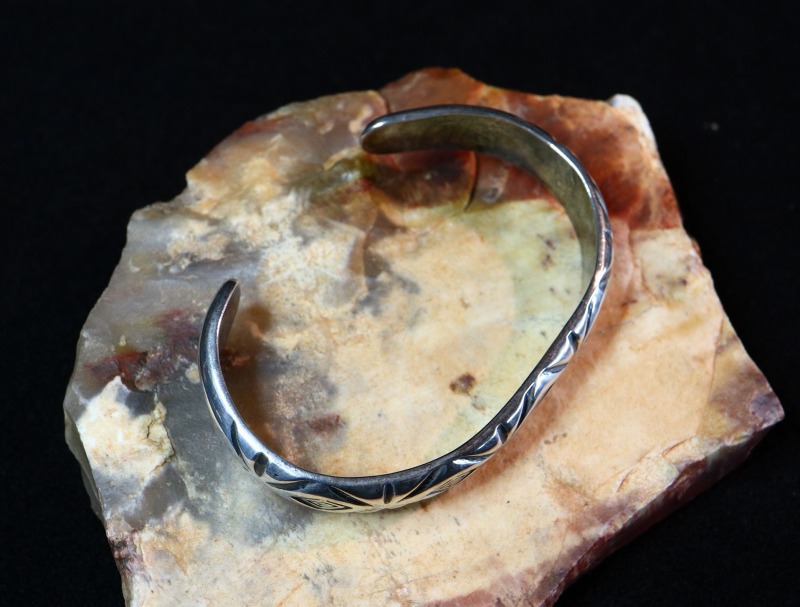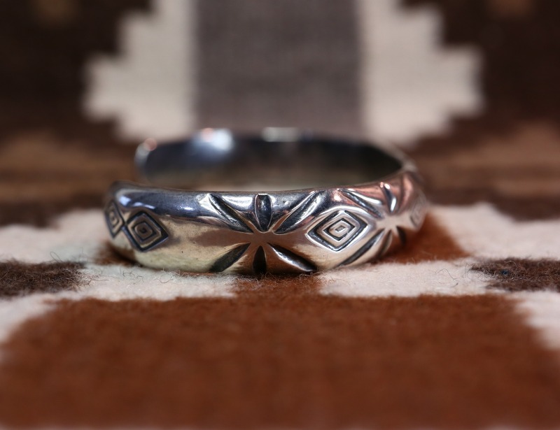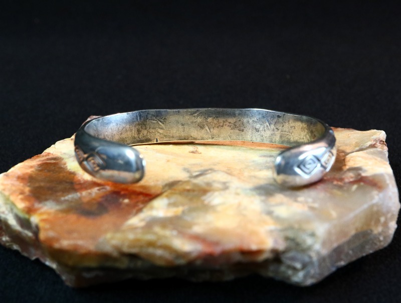 1940年代頃~1960年代前頃に作られたと思われる作品で、ある程度キャストで成形したインゴットシルバー(銀塊)をベースに、ハンマーによるパウンティングとファイルワークと呼ばれる鑢によって削るだけの技術で丁寧に造形されたバングル。連続して刻まれたダイヤ型/菱形紋様のスタンプは、『Medicine Man's Eye/メディスンマンの目』を抽象化した紋様であり、「知性・用心深さ・未来予知」などを意味するとされています。これらのディテールは全て原始的なもので、インディアンジュエリー創成期からの技術を継承した作品です。しかしながら、シルバーの質感はとてもなめらかに仕上げられ、シンプルなデザイン/造形はとても洗練された完成度を持った作品となっています。