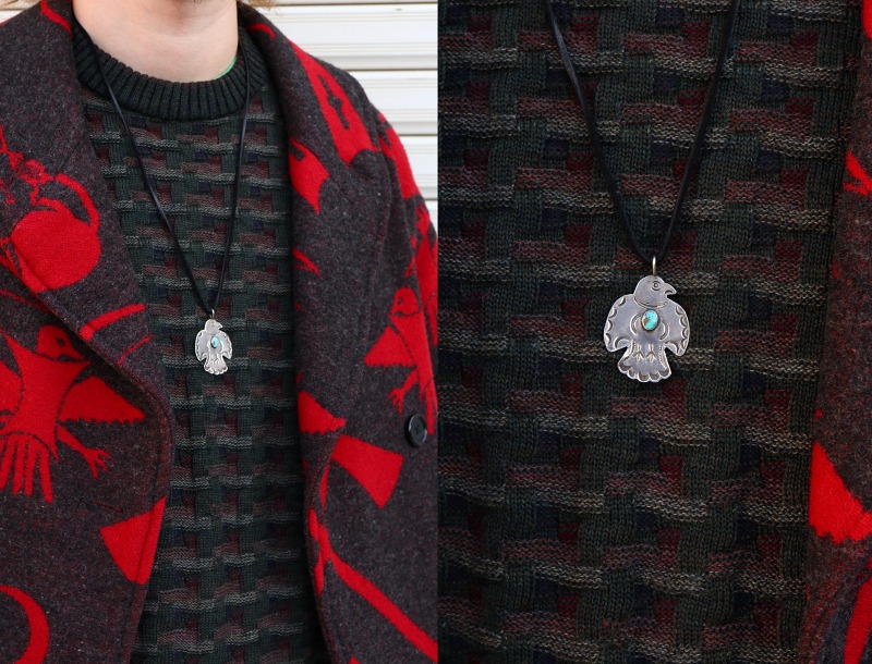 また、アイコニックで可愛い印象もあるサンダーバードモチーフは、性別を問わずお使いいただけ、アンティークインディアンジュエリー特有の質感がありますので、男性のスタイリングにも良い『ギャップ』と奥行きを与えてくれると思います。さらに、レザーレースの長さや合わせ方によって違った印象を作り、性別やスタイル・季節を問わず多くスタイルに溶け込みやすいネックレスとなっています。