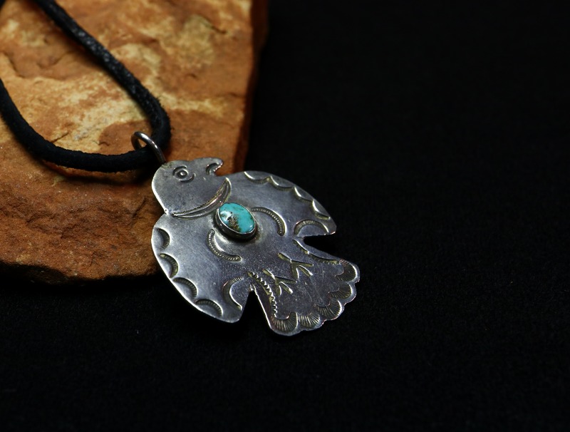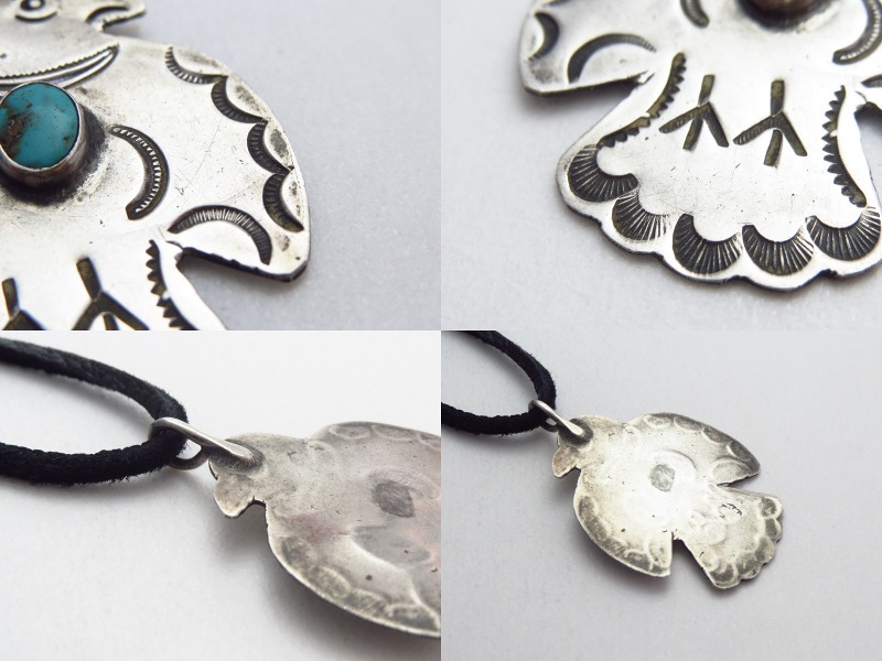 1930年代~1940年代頃に制作されたものと思われる作品で、ベースのシルバーは薄く仕上げられていますがインゴットシルバー(銀塊)からハンマーで成形されています。丁寧なカッティングワークによって少し丸みのあるサンダーバードのシェイプが構成され、そこにスタンプワークが刻まれる事によってサンダーバードの顔や脚等、細部を描き出しています。またそれはポップで可愛さのあるサンダーバードを生み出していますが、スタンプ(鏨)ツールのクオリティは、一つ一つが非常に秀逸なアンティーク作品独特のクオリティーを持っています。さらに、センターには綺麗な無添加ナチュラルのターコイズがセットされています。濃い色彩の石ではありませんがワイルドなマトリックスが入り、アンティーク作品によく馴染む素朴でナチュラルな印象を持ったターコイズです。また、ベゼル(覆輪)も量産化された作品で多く見られる『ベゼルカップ』と呼ばれる既製パーツではなくハンマーメイドされたベゼルが用いられています。