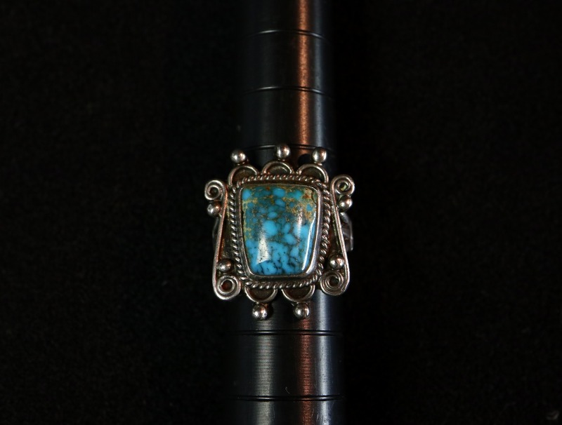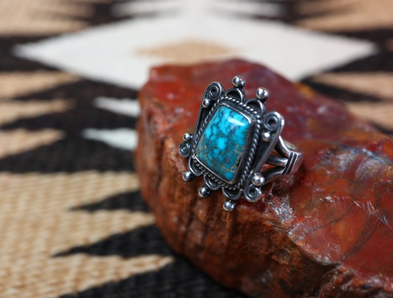 ナバホジュエリー独特の武骨な雰囲気も持っていますが、流麗で細かなシルバーワークによってクラシックでアーティーな魅力を宿しています。さらに、ハイグレードなターコイズによって上質でエレガントな印象も併せ持つ作品であり、フォーマルなシーンでも品格を損なわず普遍的な造形美は多くのスタイルにフィットするリングです。