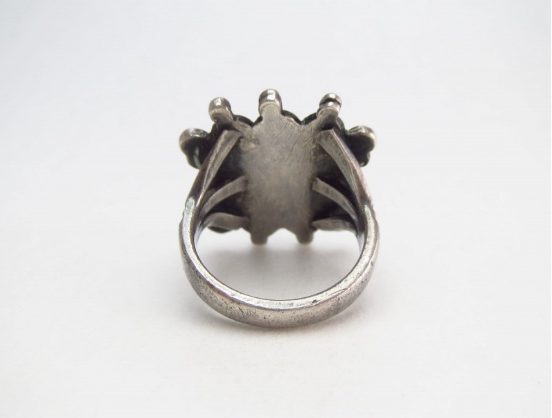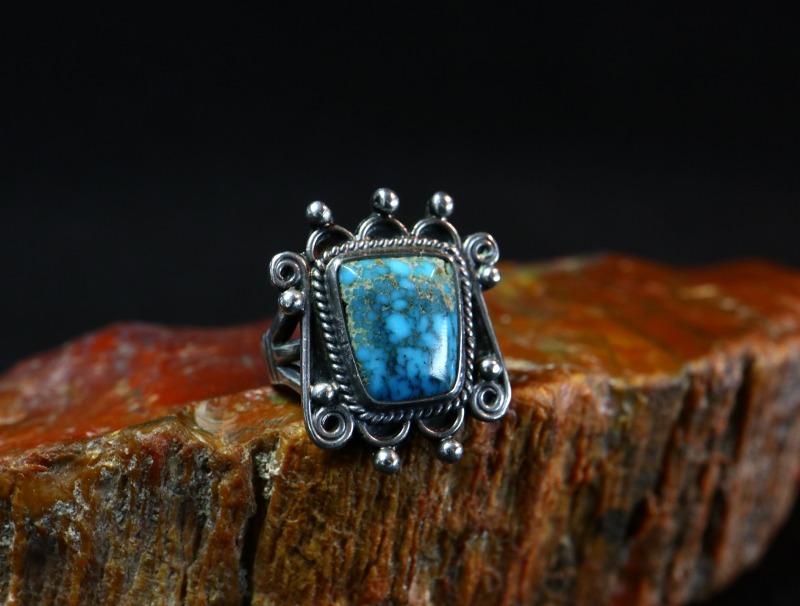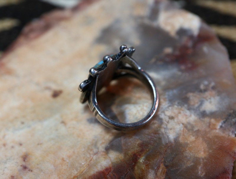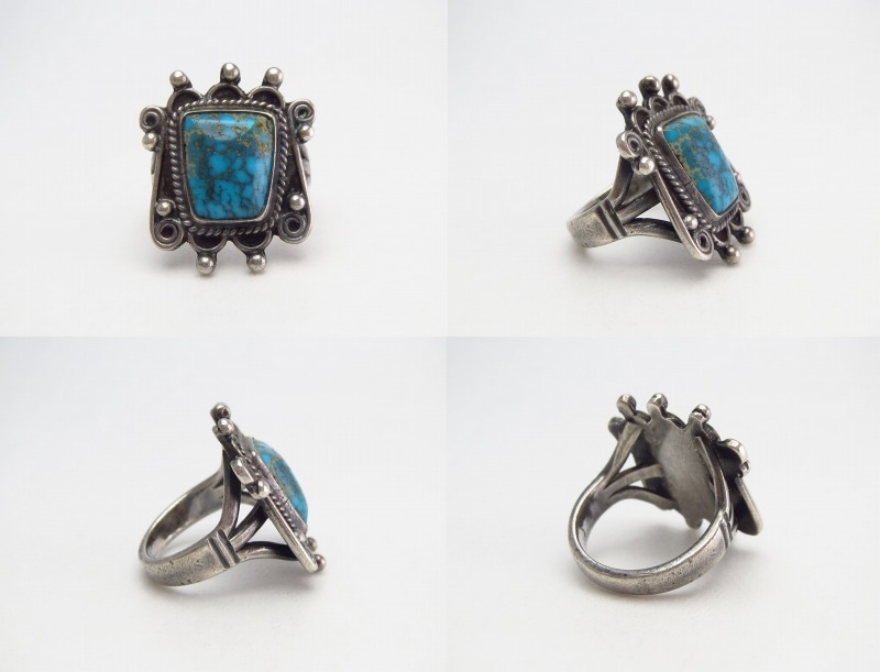 1940年代~1950年代頃の作品と思われ、おそらくインゴットシルバー(銀塊)から成形されたシャンクは、フロントが『スプリットシャンク』と呼ばれる伝統的な造形で3本に割り開かれており、フェイスに向かって幅とボリューム感を持たせた造形スタイル。フェイスは手の込んだ装飾に合わせた細かなカッティングにより、土台が構成されています。台形型にカットされた美しいターコイズをメインに、ベゼル(覆輪)にはツイステッドワイヤーが施され、それらを囲むようにシルバーワイヤーによる繊細で流麗な装飾があしらわれています。さらに、9個の小さなシルバードロップ/ボールがポイントとなっており、精緻なシルバーワークが特徴的なデザイン/造形ですがリングとしてとてもバランス良く仕上げられています。