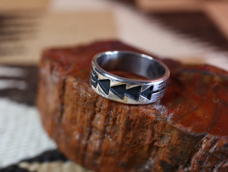 【Overlay】オーバーレイと言う技法は、シルバーの板に描いたデザインを切り抜き、下地のシルバーの上に貼り付けることで立体的に絵柄を浮き出させる技法です。スタンプワークやカッティングと組み合わされた作品も見られ、完成度を高められたオーバーレイ技法を用いた美しいホピのジュエリーは、現代に至るまでに多くの傑作を残しています。