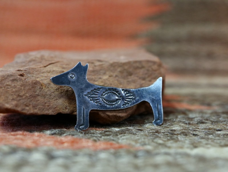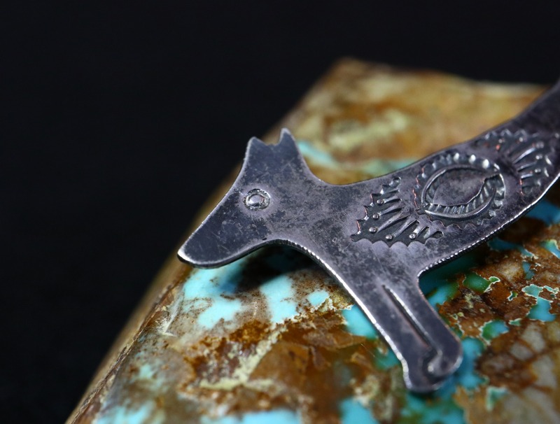 1930年代~1940年代製と思われ、おそらくインゴットシルバー(銀塊)から成形された地金のシルバーは、機械によるプレスではなく手作業により特徴的な犬のシェイプにカッティングされています。さらに、スタンプワークが刻まれることによって細部が描き出され、中央部分には力強くナバホジュエリーらしいスタンプワークが施されています。ホース/馬モチーフとも近い造形ですが、首が短くなっている点などが特徴となっています。
